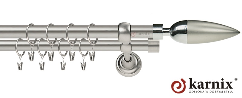 Karnisze Rzymskie z kolekcji firmy KARNIX to  propozycja dla wielbicieli tradycyjnego wzornictwa. Wprowadzając do sprzedaży tę linię karniszy, postanowiliśmy połączyć przeszłość z przyszłością, aby wykreować ponadczasową kolekcję. Uniwersalność i pomysłowość  to słowa klucze, które w skrócie charakteryzują kolekcję karniszy rzymskich. Elementy karniszy w całości wykonane są z metalu pokrytego powłoką galwaniczną oraz warstwą lakieru, która zwiększa odporność na ścieranie. Uwaga. Inox oraz antracyt dostępne są przy średnicach 19 i 25mm.