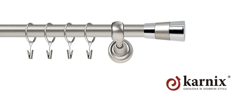 Karnisze Metalowe Rzymskie z kolekcji firmy KARNIX to  propozycja dla wielbicieli tradycyjnego wzornictwa. Wprowadzając do sprzedaży tę linię karniszy metalowych, postanowiliśmy połączyć przeszłość z przyszłością, aby wykreować ponadczasową kolekcję. Uniwersalność i pomysłowość  to słowa klucze, które w skrócie charakteryzują kolekcję karniszy metalowych rzymskich. Elementy karniszy w całości wykonane są z metalu pokrytego powłoką galwaniczną oraz warstwą lakieru, która zwiększa odporność na ścieranie. Uwaga. Inox oraz antracyt dostępne są przy średnicach 19 i 25mm.