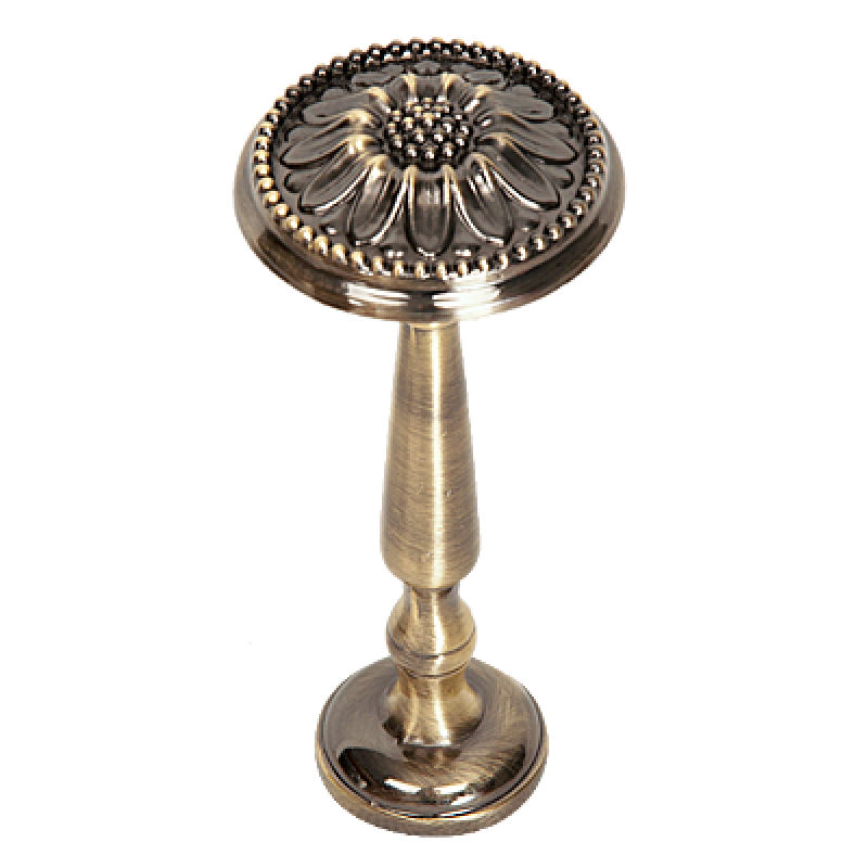 Rozeta do upinania dekoracji okiennych w kolorze antyk mosiądz (stare złoto) wykonana z metalu pokrytego powłoką galwaniczną oraz warstwą lakieru, która zwiększa odporność na ścieranie. W komplecie kołek rozporowy. Długość rozety to 13cm